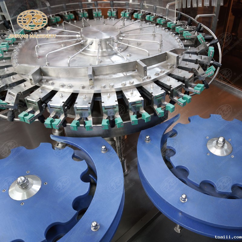 三合一含汽饮料灌装机集清洗、灌装、旋盖于一体的灌装设备,成套饮料生产线适合汽水、可乐、苏打水、气泡水等。玻璃瓶含汽饮料灌装机组内部一次完成洗瓶、灌装、封盖三道工序,瓶子磨损小、传动准确平稳、瓶型更换便捷。