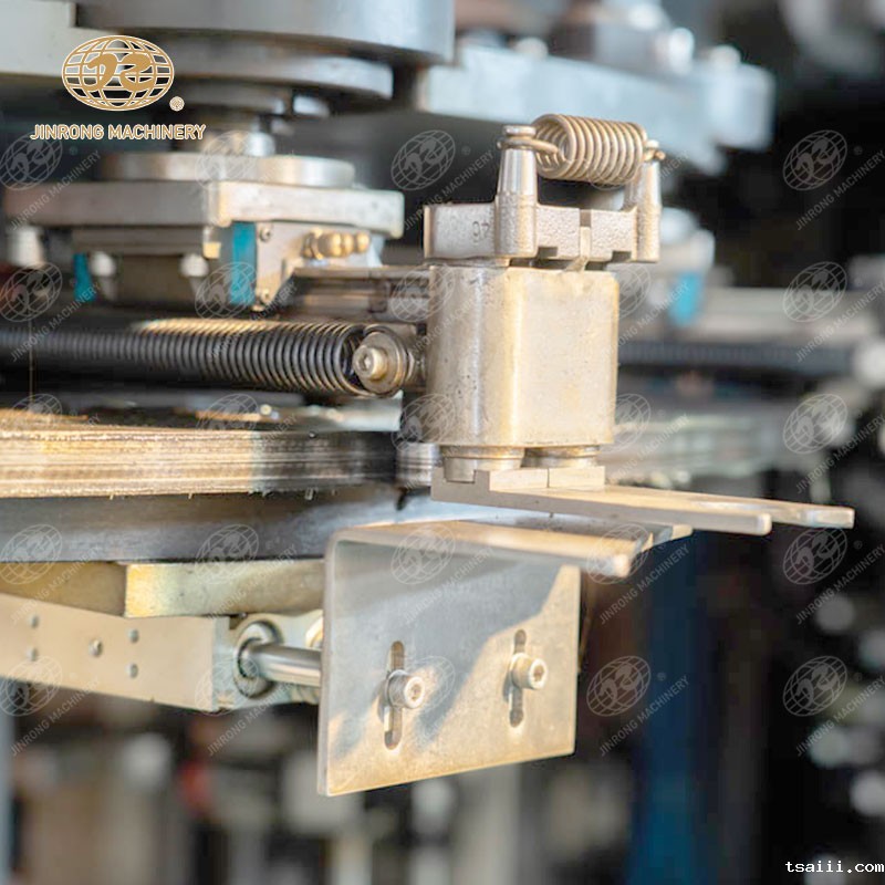 全自动旋转式吹瓶机,有进坯斗、上料机构、 理坯机构、下料机构、进坯盘、加热器、出坯盘组成的加热系统,由合模机构、拉伸气缸、封口气缸组成的拉吹机。吹瓶设备特征在于所述的加热系统和拉吹机安装在同一台机座上,电箱安装在机座内的右后角,进坯斗、上料机构、 理坯机构、下料机构安置在电箱和加热器之间。拉吹机是四个工位,在四个工位的拉吹机旁安装一个取坯夹手机构和一个取瓶夹手机构,在取坯夹手机构和取瓶夹手机构中分别有两个取坯机械手和两个取瓶机械手。实用新型旋转式吹瓶机,布局非常紧凑,节约了占用空间,缩短了传递间距,大大降低成本,并且整机为一整体,吊装、运输时无需拆分。